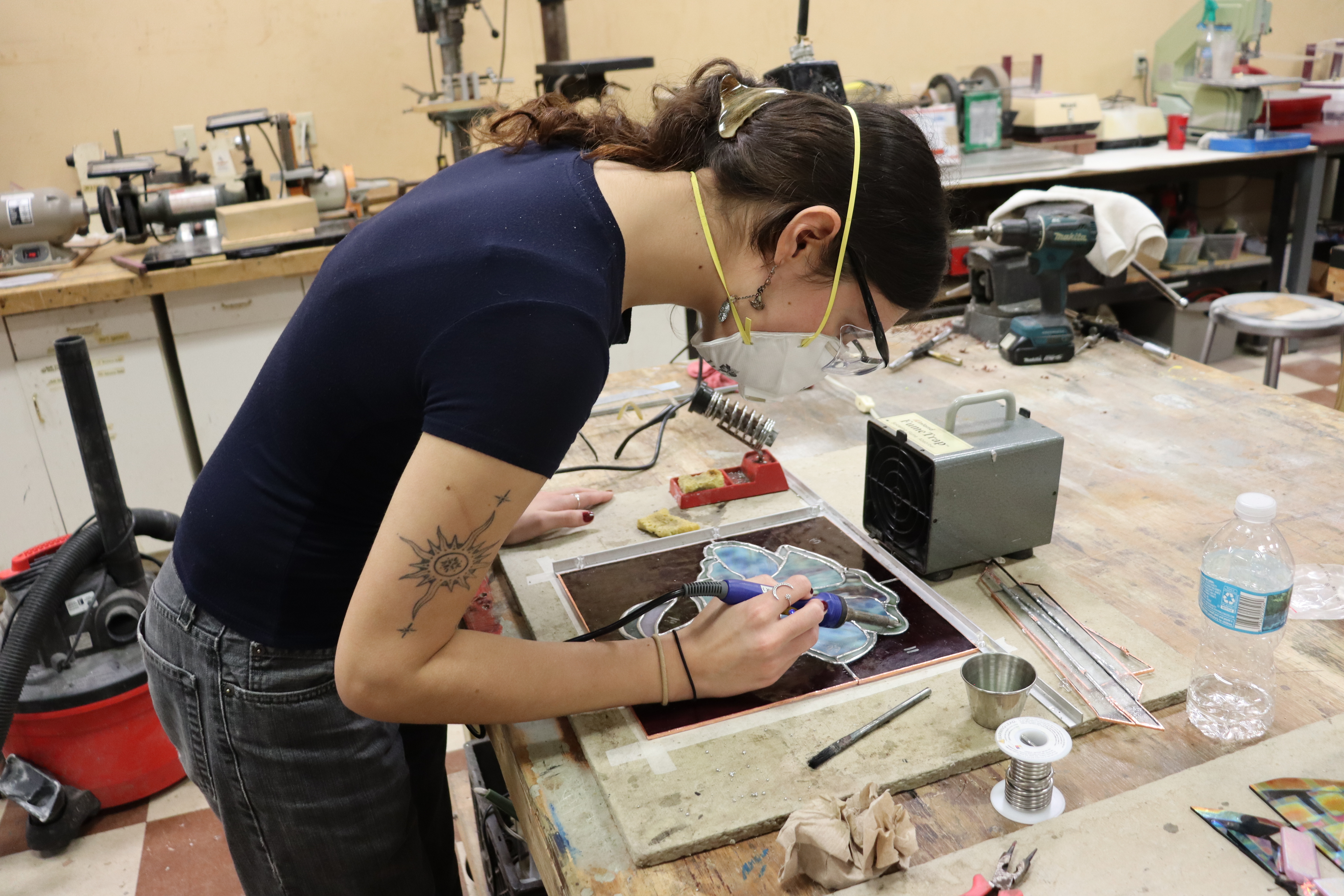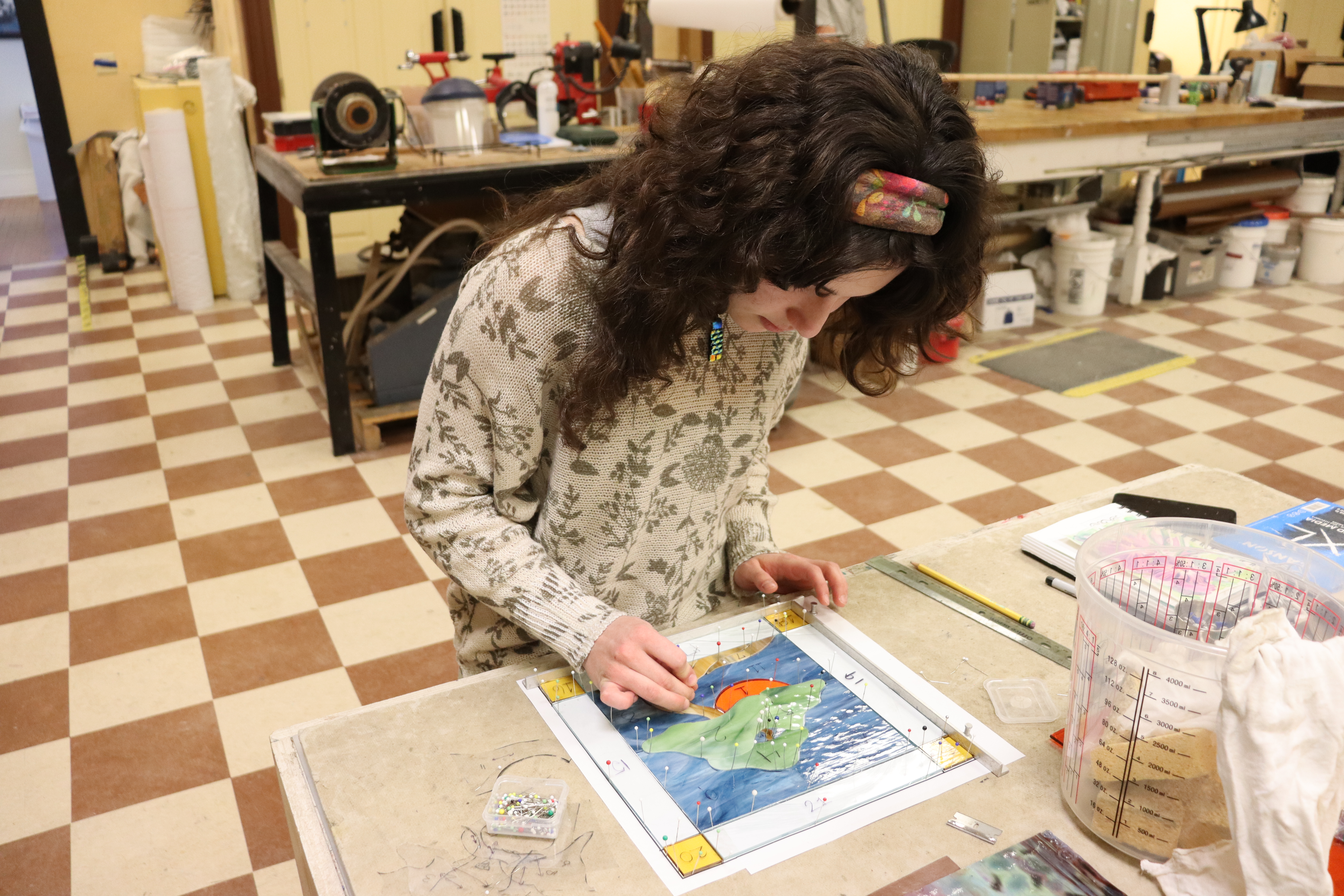 Intern Anna Garufo working on a personal stained glass piece