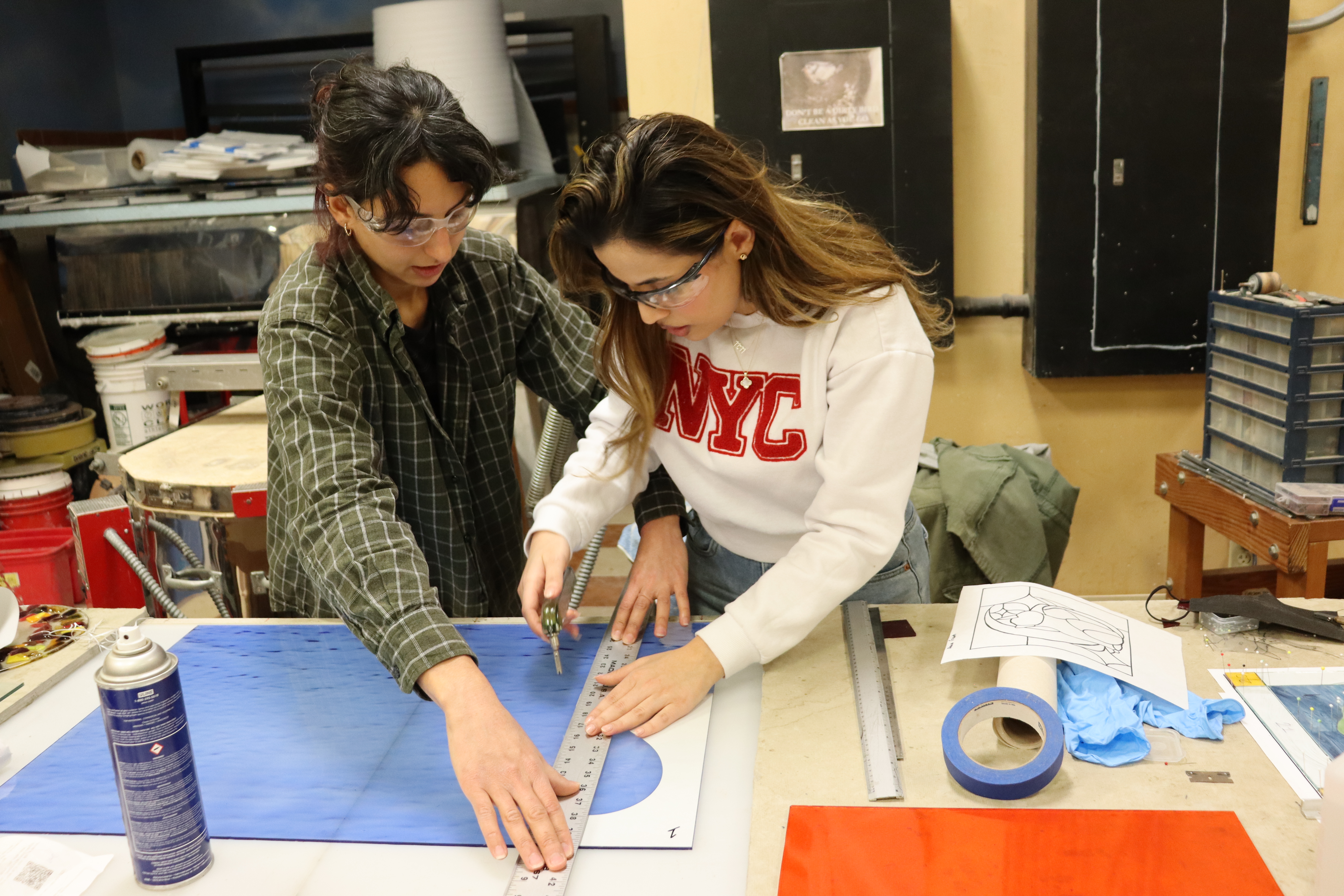 Intern Sarah Aldwaikat working on glass cutting with MCS Studio Artist Larisa Cladakis