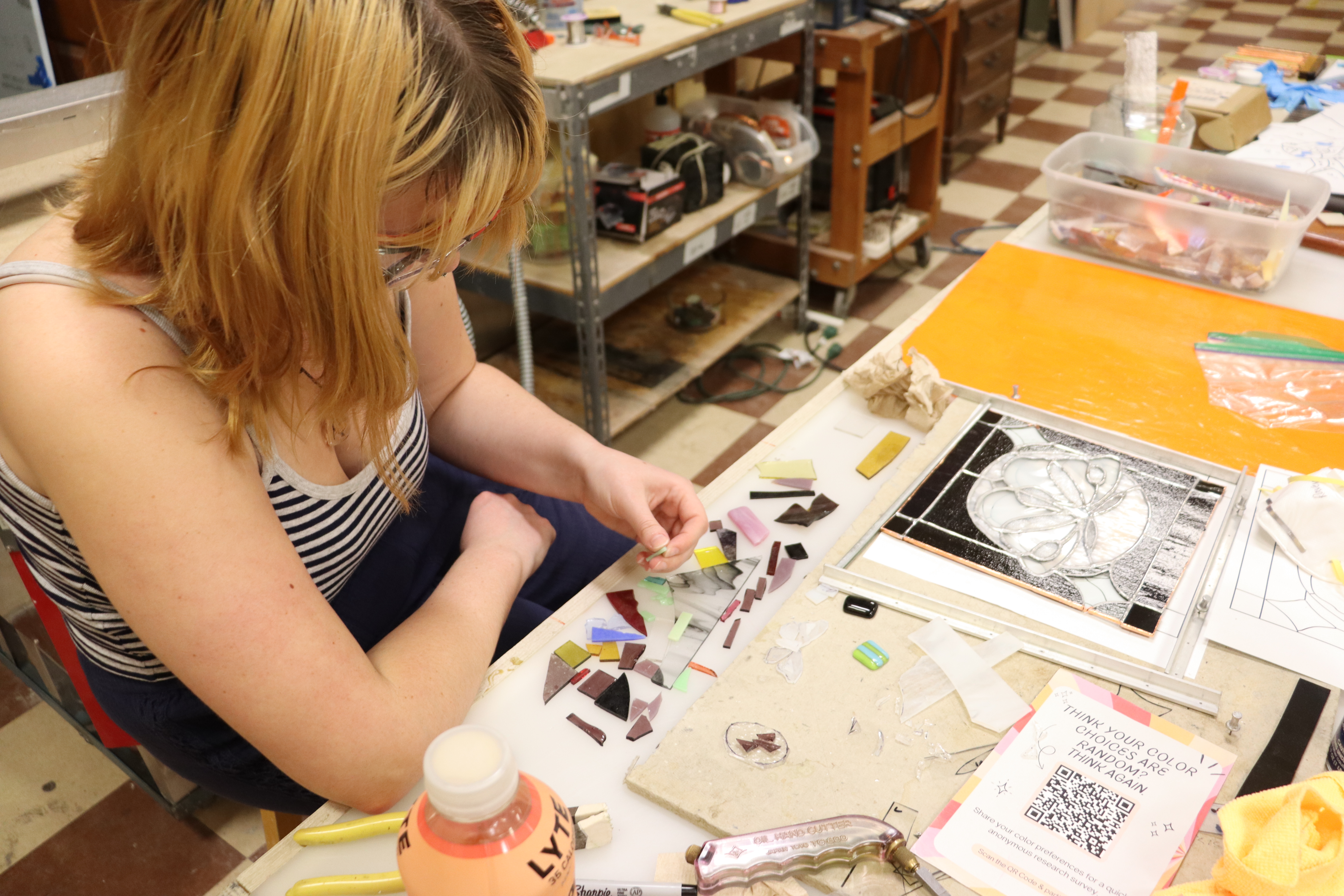 Intern Kamila Cascardo working on a personal stained glass piece