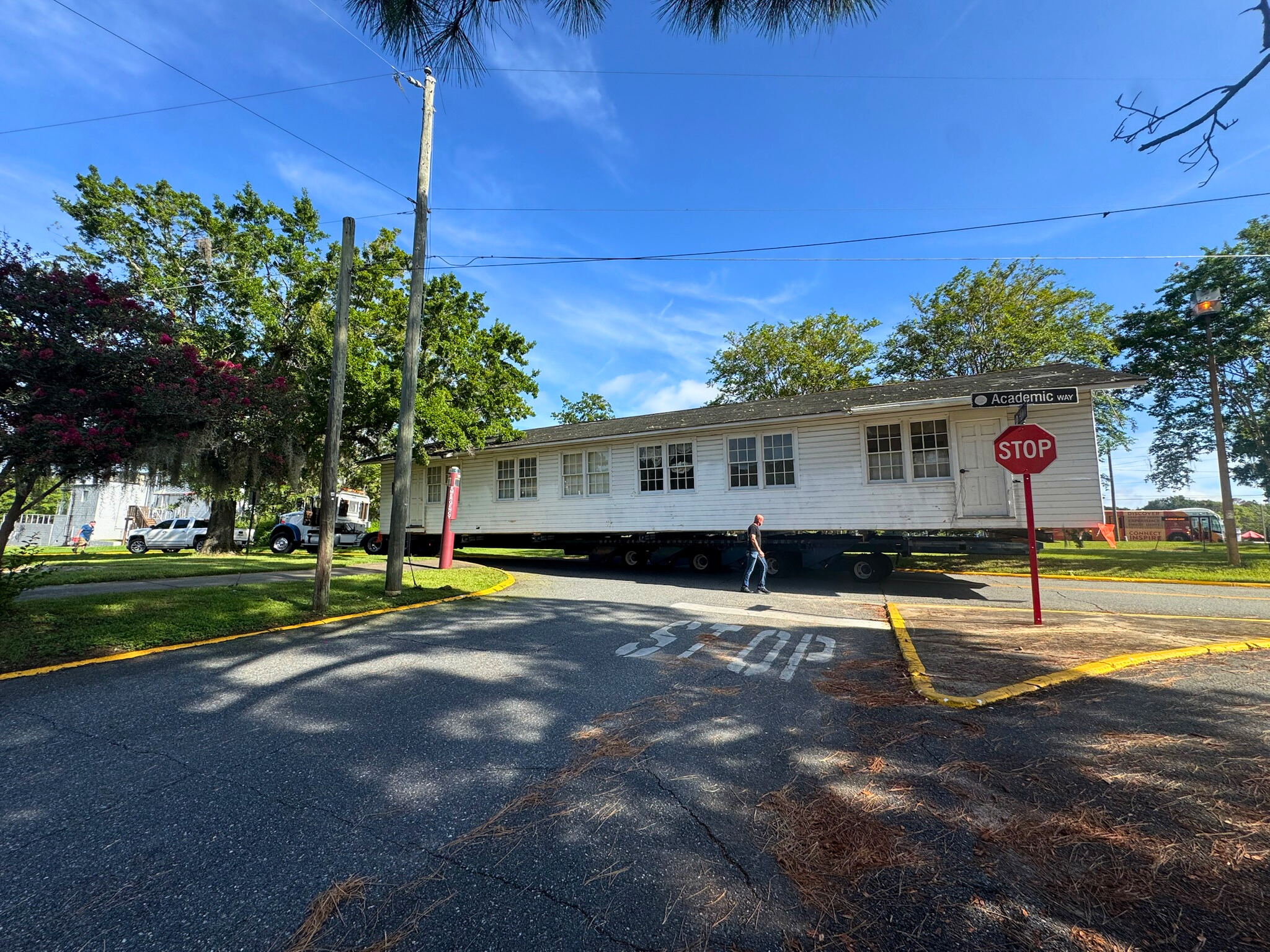 A piece of World War II history has found a new home. On Tuesday, August 12, FSU Facilities managed the relocation of barracks from the northwest edge of Main Campus to Tallahassee State College (TSC) for preservation at the future Dale Mabry Army Air Field Museum. A heavy-duty hydraulic modular trailer transported the 1,600-square-foot former duplex, which had been repurposed as administrative space at FSU.